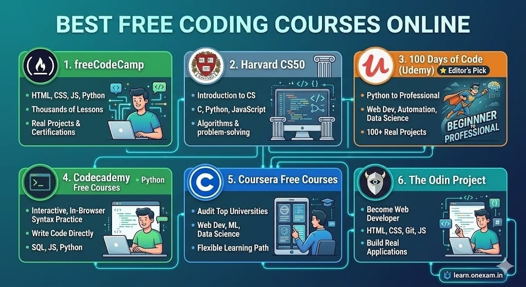 The best free coding courses online for most beginners are freeCodeCamp (for web development) and Harvard CS50 (for computer science fundamentals). Both are 100% free, well-structured, and respected by employers worldwide.